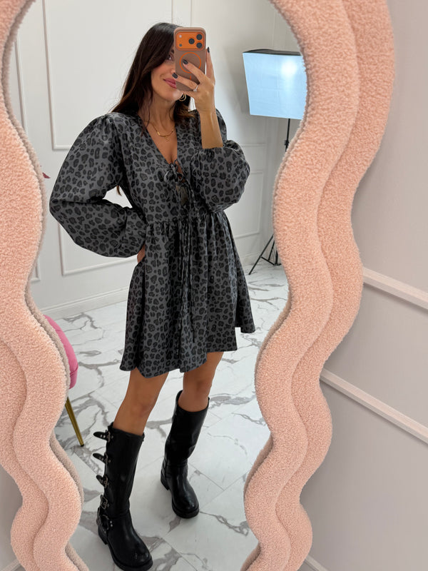 Abito modello svasato, in fantasia leopardata, con taglio ad impero, scollo a V, lacci per chiudere la scollatura, manica ampia con elastico nel polsino, spalla leggermente a sbuffo. Vestibilità regolare, la modella è alta 160cm e indossa taglia XS.
