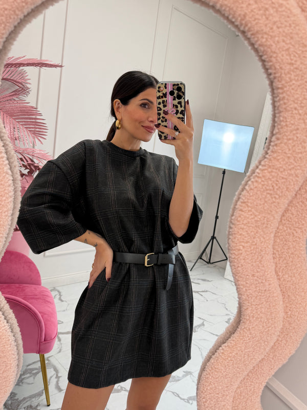Abito a t-shirt over girocollo in tessuto spesso a quadri. Con cintura removibile. Vestibilita’ comoda.