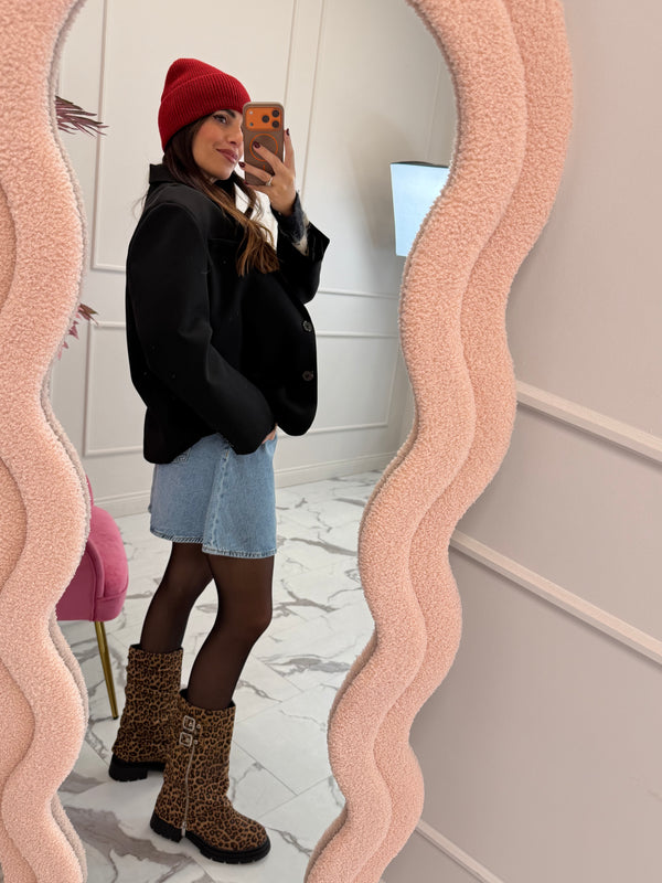 Anfibio in fantasia animalier, stile grunge, altezza metà polpaccio, presenta zip e fibbie regolabili, suola carroarmato. Calzata regolare.