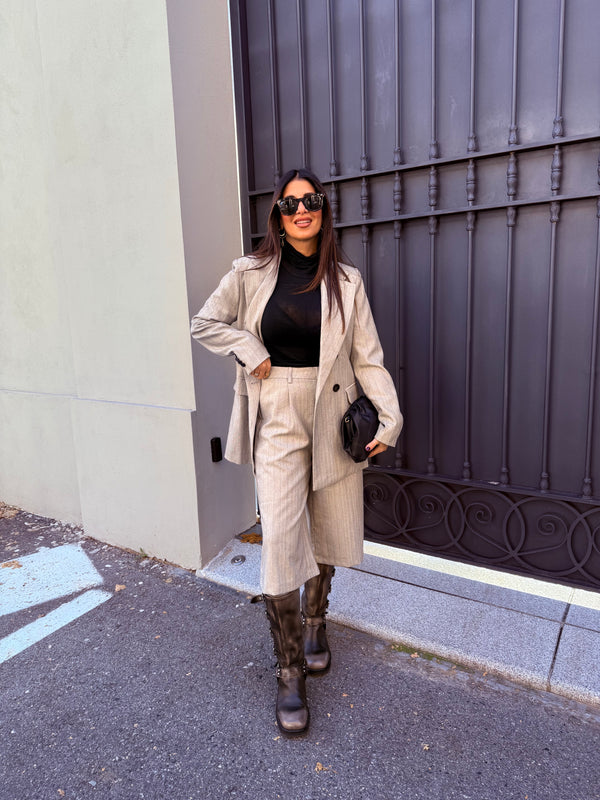 Maxi bermuda, in tessuto, fantasia gessata, vita regolare, presenta tasche, pence nella parte anteriore, chiusura con gancio e zip. Vestibilità regolare, la modella è alta 160cm e indossa la taglia XS.