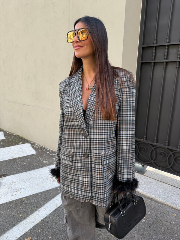 Blazer modello over, monopetto, collo reverse, chiusura con due bottoni, presenta tasche con patta nella parte anteriore, fantasia a quadri, dettaglio piume nei polsini, interno foderato. Vestibilità over la modella indossa taglia S ed è alta 160cm .
