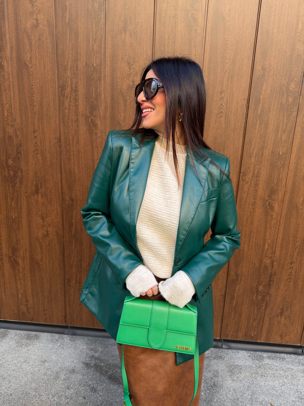 Blazer in ecopelle modello mono petto. Interno foderato. Vestibilita’ regolare. La modella indossa la taglia XS
