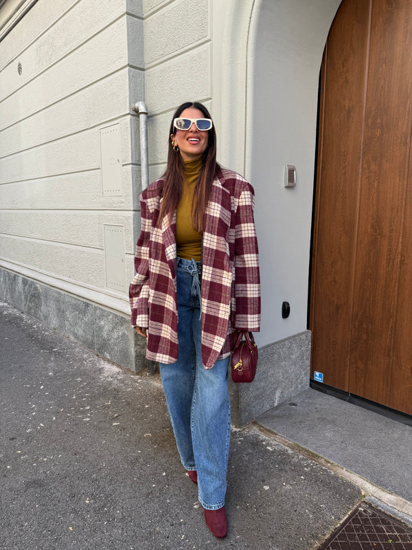 Blazer coat modello over,monopetto, taglio maschile con collo reverse, spallina imbottita,in fantasia quadri, tasche con patta nella parte anteriore e taschino filetto lato cuore, interno foderato, chiusura con due bottoni. Vestibilità over ,la TAGLIA è UNICA e la modella è alta 160cm.