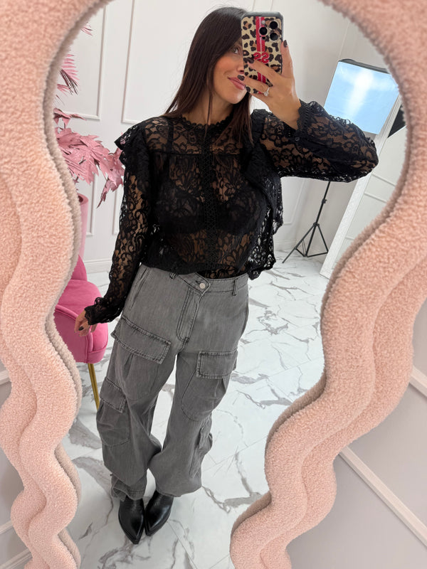Blusa in pizzo, girocollo con merletti, maniche ampie con rouches, modello scatolina, lavorazioni nella parte anteriore. Chiusura con un bottoncino dietro al collo, vestibilità regolare, la modella è alta 160cm e indossa taglia XS.