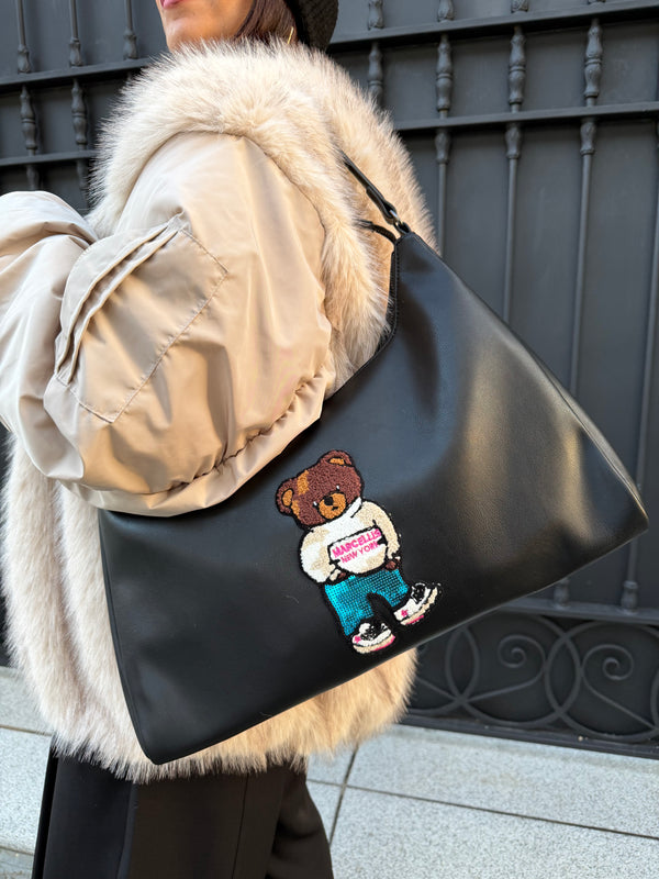 Borsa in ecopelle a spalla con ricamo sul davanti, chiusura tramite zip.