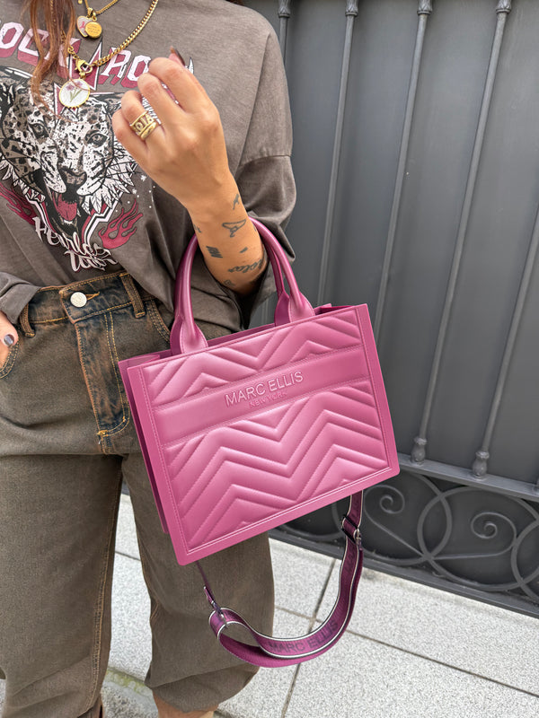 Borsa Marc Ellis trapuntata con manici, logo in rilievo sul fronte, tracolla logata removibile in tessuto, pochette interna chiusa con zip da poter portare anche singolarmente.