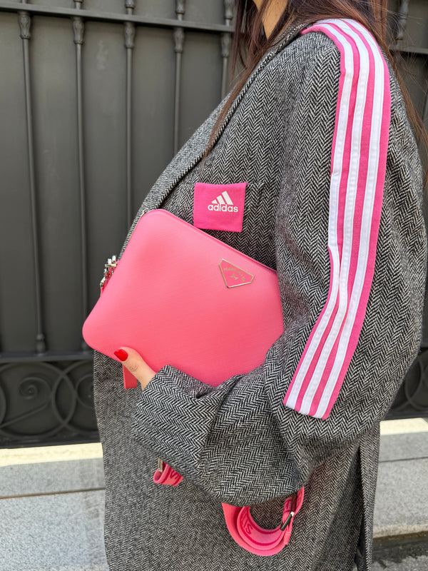 Borsa in PVC con targhetta logata sul davanti. La borsa presenta due tipi di tracolla: laccetto per polso rimovibile / tracolla regolabile rimovibile.