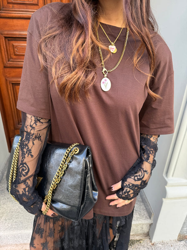 Borsa tracolla/ a spalla, chiusura con patta a calamita, interno con doppia tasca, taschino con zip e taschino a patta. Logo nella parte anteriore, effetto ecopelle lucida.