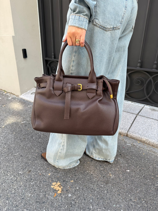 Borsa in ecopelle martellata, da portare a mano o a tracolla. Manici rigidi in similpelle. Chiusura con cerniera. Dettaglio cintura passante con fibbia con chiusura regolabile.Tracolla in similpelle con fibbia regolabile con gancio in metallo removibile. Tasca interna con cerniera e taschina piatta. Logo vicolo lettering impresso a caldo sul lato borsa.
