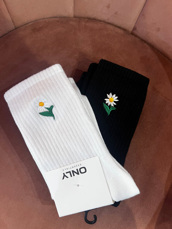 Calze in misto cotone, altezza sopra alla caviglia, dettaglio Margherita ricamata, disponibile in due varianti colore, taglia unica, due paia per pacco.