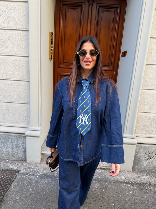 Camicia in denim scuro modello oversize scampanato, spacchetti laterali, manica ampia, presenta taschino nella parte anteriore . Chiusura con bottoni nella parte anteriore. Vestibilità over, la modella è alta 160 cm e indossa taglia S.