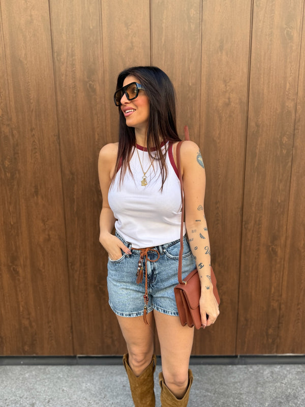 Canotte con scollo all’ americana in contrasto colore, a costine, tessuto stretch, vestibilità regolare. La modella è alta 160cm e indossa la taglia XS.