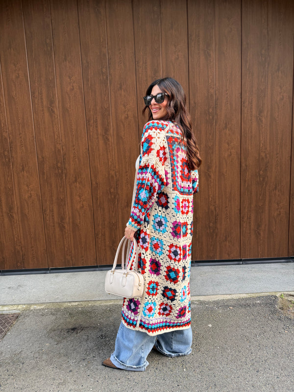 Cardigan lungo in crochet, spalla scesa, taglio a kimono. La modella è alta 160cm e indossa una TAGLIA UNICA.