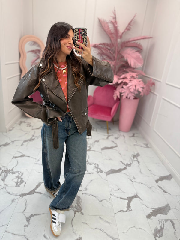 Chiodo in ecopelle, modello oversize, collo reverse, chiusura con zip e cintura, spalla scesa, manica morbida, interno foderato, presenta taschini con zip nella parte anteriore. Vestibilità over, la modella è alta 160cm e indossa taglia XS.