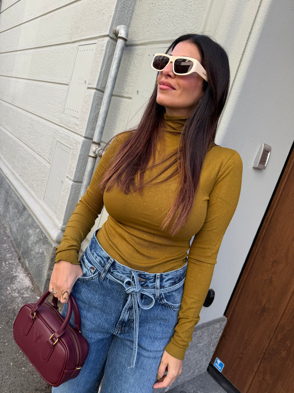 Dolcevita, a micro costine, super stretch, bordini effetto voulant, micro strass all over, vestibilità regolare. La modella è alta 160cm e la TAGLIA è UNICA.