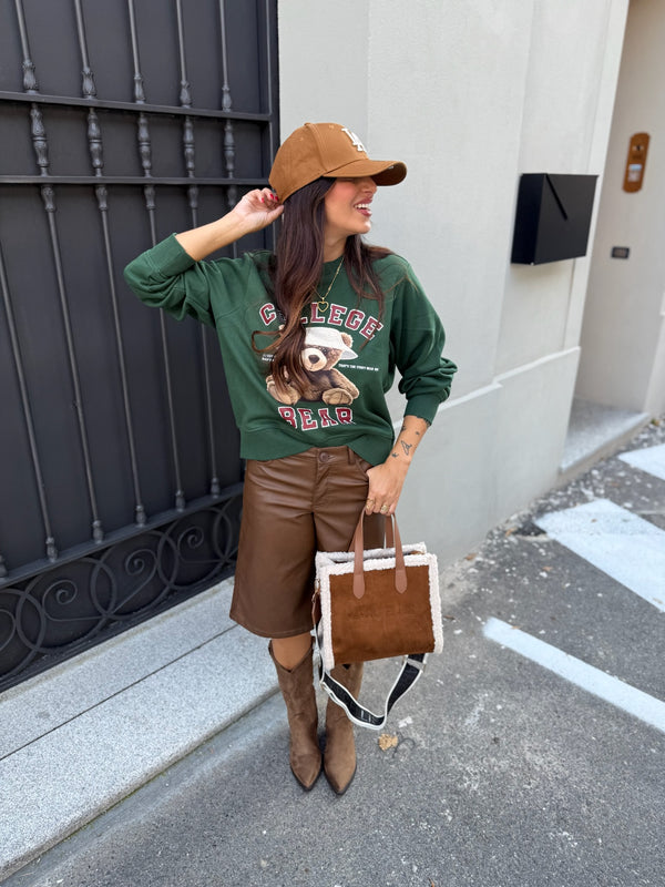 Felpa girocollo felpata con stampa orsetto. Vestibilita’ regolare. La modella indossa la M