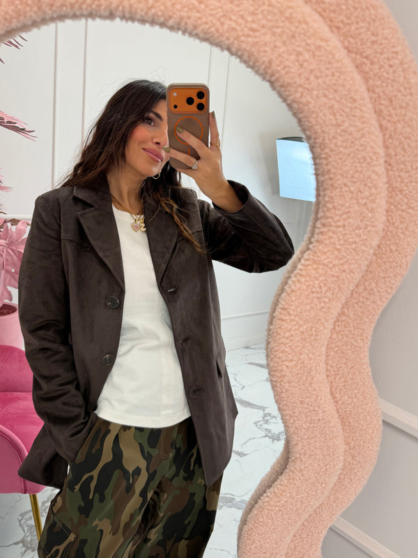 Giacca in suede, monopetto, con collo reverse, chiusura con 3 bottoni nella parte anteriore, presenta tasche con patta , interno foderato. Vestibilità regolare, la modella è alta 160 cm e indossa taglia XS.