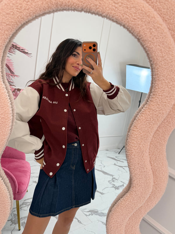 Giacca college modellino morbido, con maniche in ecopelle, bottoni e e tasche a contrasto, presenta elastico in vita, chiusura con bottoni poussoir. Con ricamo sul retro. Foderato internamente.