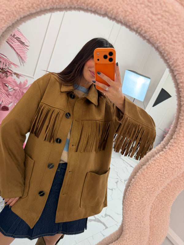 Giacca in suede, con frange nella parte anteriore e posteriore, tasconi nella parte anteriore, chiusura con abbottonatura. Vestibilità regolare, la modella è alta 160cm e indossa la taglia S.