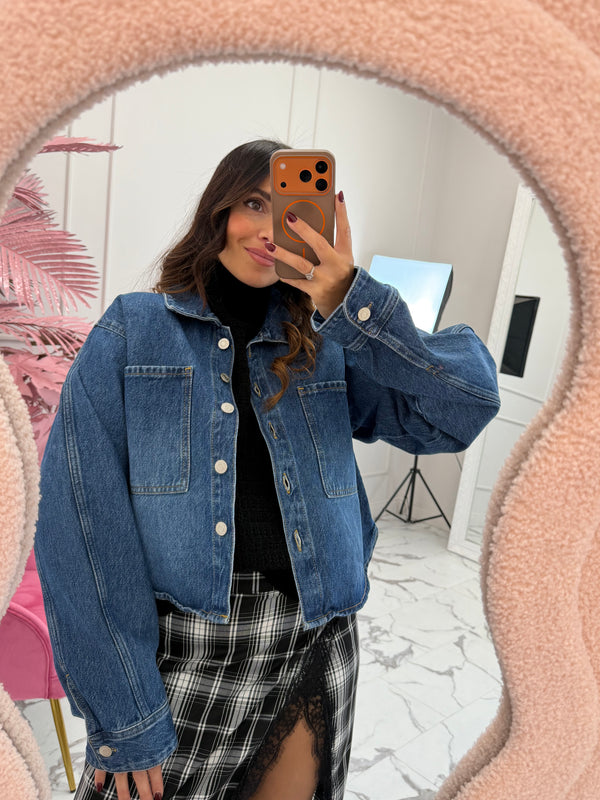 Camicia/Giacca in denim, modello corto a scatolina, presenta tasche nella parte anteriore, vestibilità comoda. La modella è alta 160cm e indossa la taglia XS.