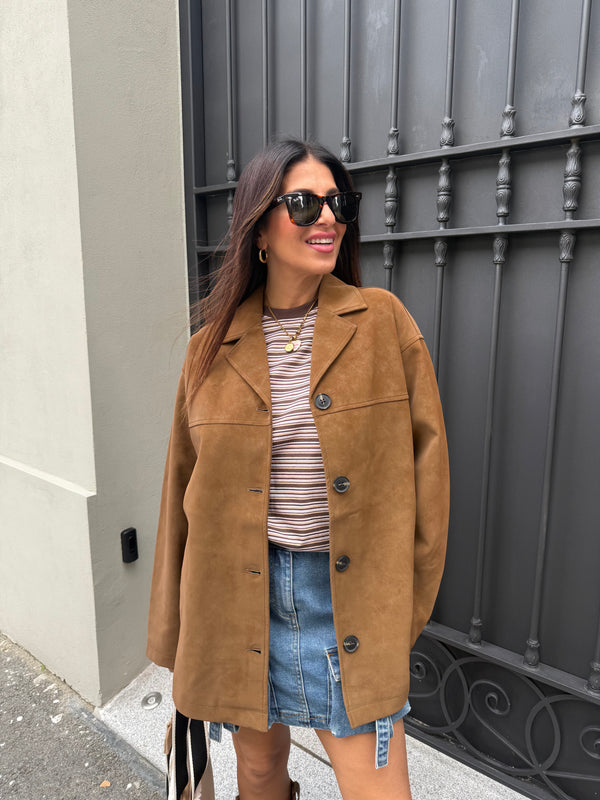 Giacca effetto scamosciato, monopetto, con collo reverse, chiusura con bottoni nella parte anteriore, presenta tasche, interno foderato. Vestibilità regolare, la modella è alta 160 cm e indossa taglia XS.
