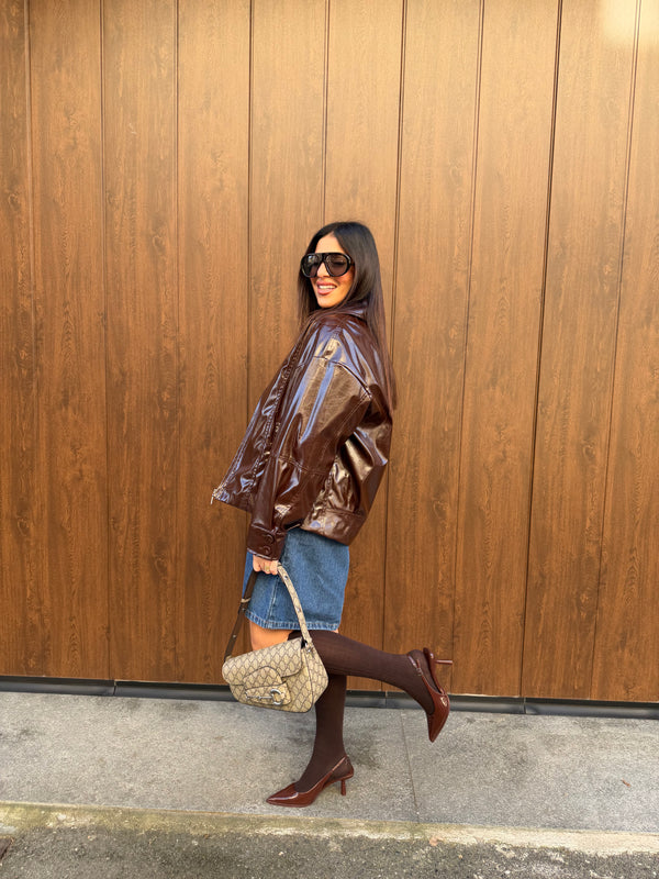 Giacca in vernice con chiusura con zip. Interno sfoderato. Peso adatto alle mezze stagioni. Vestibilita’ regolare. La modella indossa la taglia S.