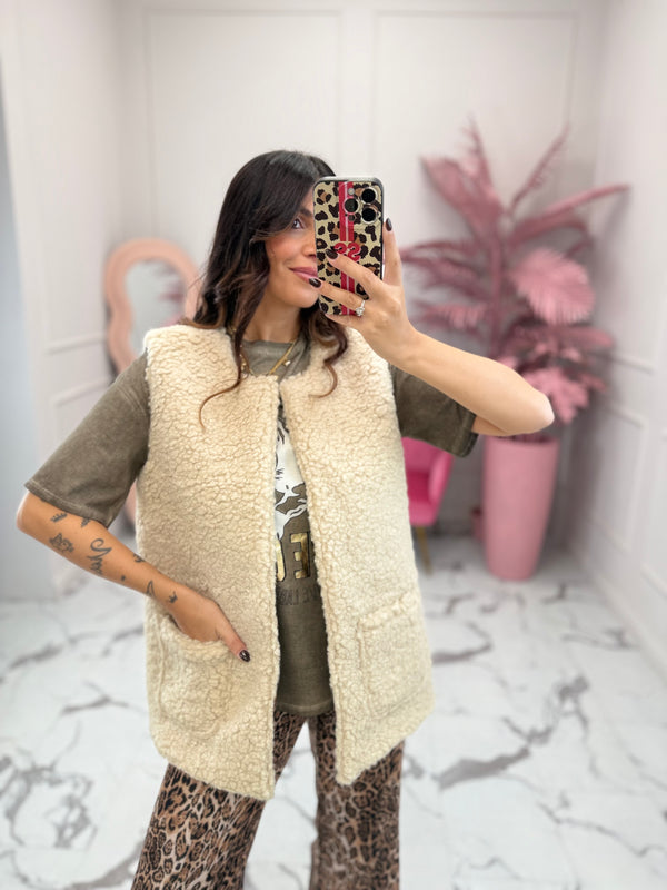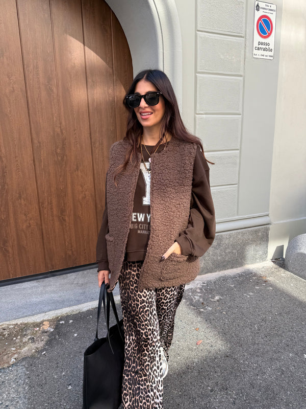 Gilet teddy imbottito. Modello fit morbido con scollo rotondo. Tasche frontali. Interno imbottito fantasia animalier. Taglie S ed M ( veste abbondante )