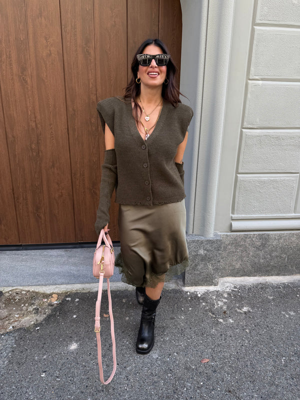 Gonna asimmetrica in raso con pizzo sul fondo. Presenta elastico in vita, vestibilità regolare.