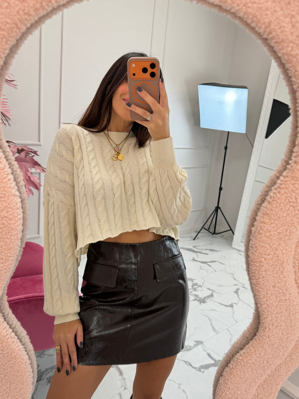 Gonna in vinile con tasche finte sul davanti, leggermente svasata sul fondo, chiusura tramite zip sul retro.