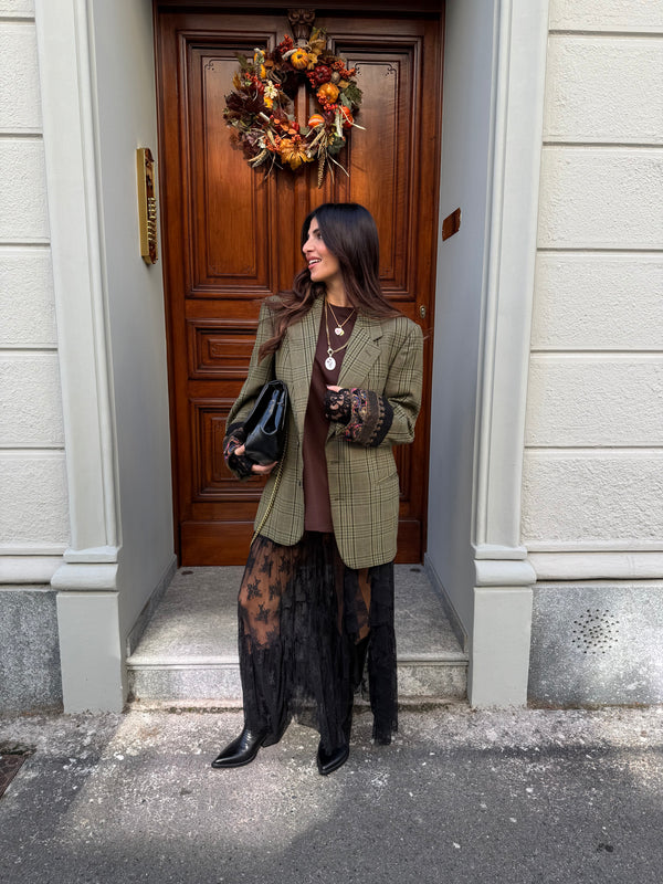 Gonna lunga in pizzo con spacco laterale, presenta coulotte e balze, vestibilità regolare. La modella è alta 160cm e indossa taglia XS.