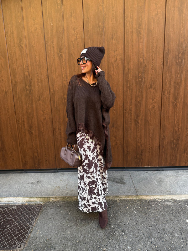 Gonna lunga, modello dritto leggermente svasato, in fantasia muccata, in tulle, con fodera ed elastico in vita. Vestibilita’ regolare.