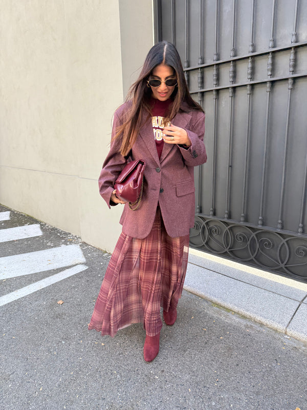 Gonna lunga, modello ampio a ruota, tessuto leggero, semi trasparente, in fantasia tartan, coulotte integrata, elastico in vita, vestibilità regolare. La modella è alta 160cm e indossa la taglia S/M.