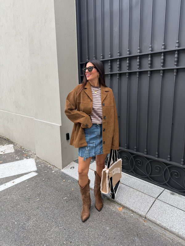 Gonna mini in denim, con tasconi nella parte anteriore, modello cargo, vita bassa, presenta passanti, chiusura con bottone e cerniera. Vestibilità regolare, la modella è alta 160cm e indossa la taglia XS.