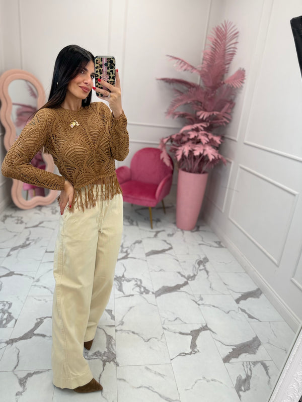 Jeans modello wide leg, palazzo, con elastico in vita e coulisse, presenta tasche e taschino nella parte posteriore destra. Vestibilità regolare, la modella è alta 160cm e indossa la taglia XS. Lunghezza 32.