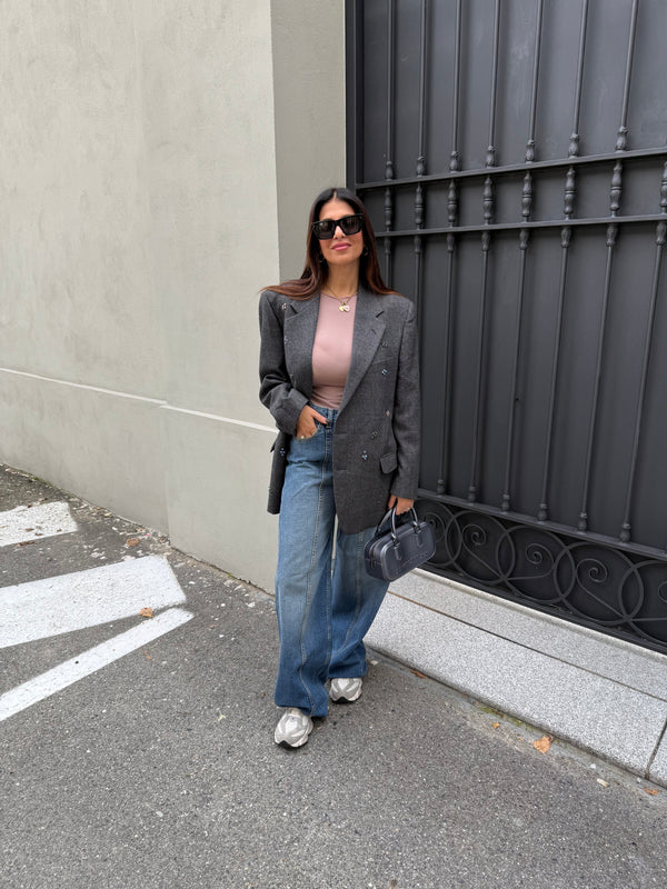 Jeans modello wide leg, a vita alta, cuciture su tutta la parte anteriore, presenta tasche nella parte anteriore e posteriore e passanti, chiusura con zip e bottone.