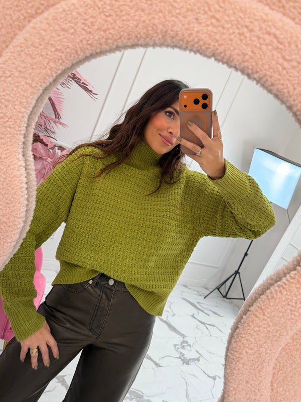 Maglioncino in simil ciniglia, lavorato, con collo alto morbido, spalla scesa, modello a scatolina, vestibilità regolare. La modella è alta 160cm e indossa la taglia XS.