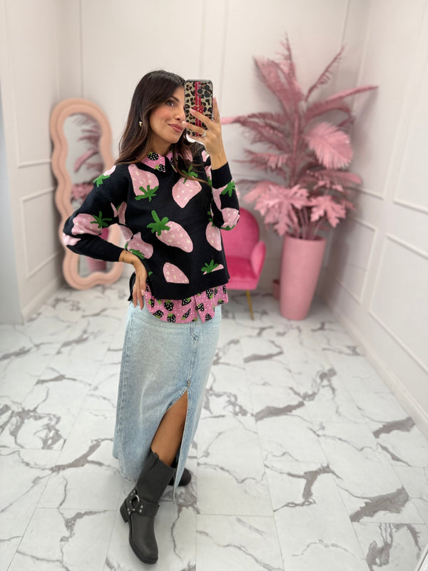 Maglioncino girocollo, in fantasia fragole all over , asimmetrico (più corto davanti e più lungo dietro), spacchetti laterali, modellino a scatolina, spalla scesa. Vestibilità regolare, la modella è alta 160cm e indossa la taglia XS.