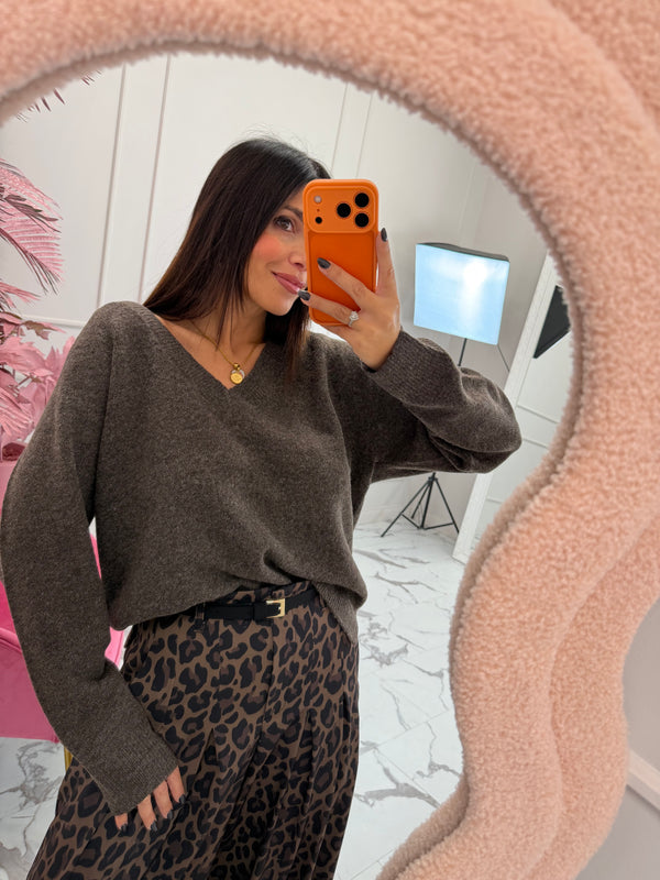 Maglioncino reversibile, scollo a V o scollo arrotondato, modello over corto, vestibilità regolare. La modella è alta 160cm e indossa la taglia XS.
