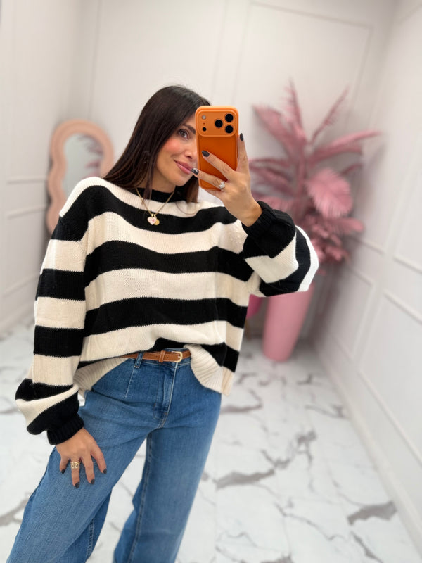 Maglioncino girocollo a righe bicolor. Manica a palloncino. Vestibilita’ comoda. Taglia unica