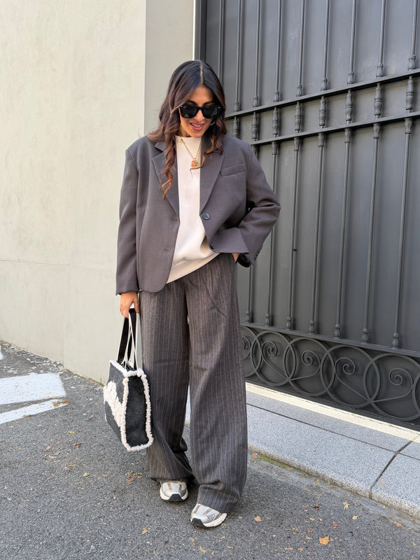 Pantalone modello palazzo, con pence, fantasia gessata con mini strass all over, presenta tasche, passanti per cintura, chiusura con gancetti e bottone. Vestibilità regolare, la modella indossa taglia XS.