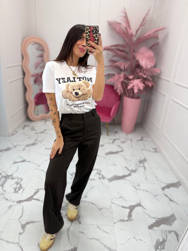 Pantalone a vita alta, taglio classico, presenta passanti per cintura e tasche, chiusura con gancio e zip. Vestibilità regolare, la modella indossa la taglia XS ed è alta 160cm.