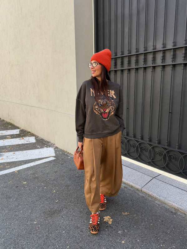 Pantalone modellino ovetto, con peces sul davanti, elastico in vita, presenta tasche.