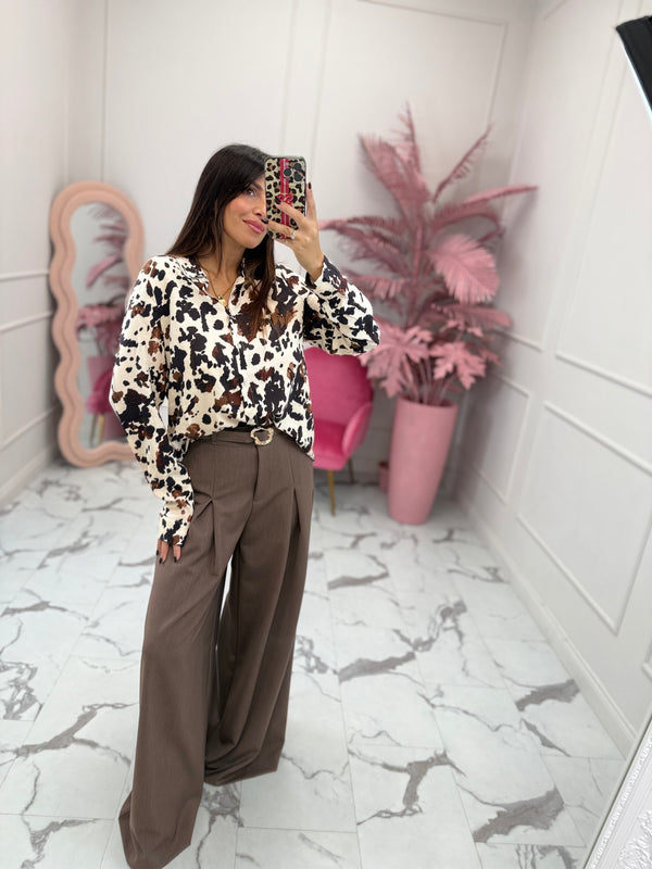 Pantalone vita alta,modello palazzo con pence sul davanti, presenta tasche e cinturino con fibbia in vita. Vestibilità regolare, la modella è alta 160cm e indossa taglia XS.