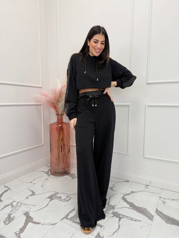 Pantalone tuta con elastico vita alta in raso e coulisse con effetto taglio vivo al fondo. Vestibilita’ regolare. La modella indossa la S.