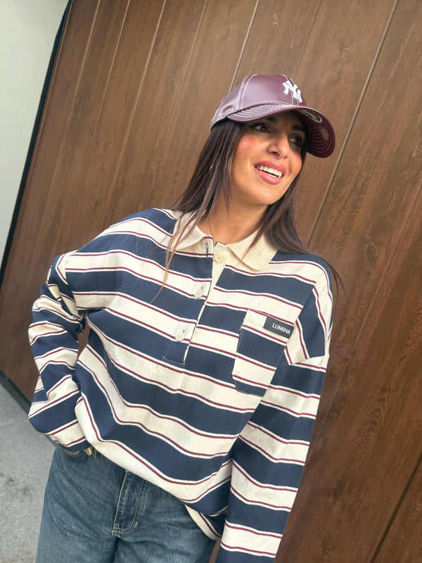 Polo a manica lunga, spalla scesa, modello over, fantasia a righe, taschino lato cuore con patch logo, interno garzato. Vestibilita’ comoda. La modella è alta 160cm e la TAGLIA è UNICA.