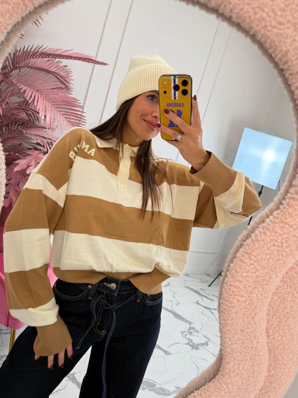 Maglia polo a righe con scritta “Amour”. Vestibilita’ comoda. Taglia unica.