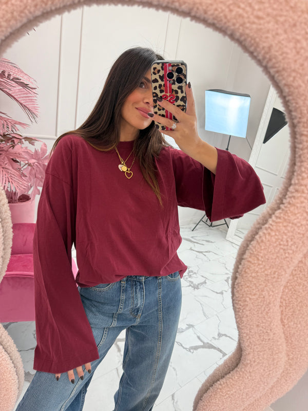 T-shirt manica lunga, girocollo, modellino over, manica ampia, vestibilità comoda. La modella è alta 160cm e indossa taglia XS.
