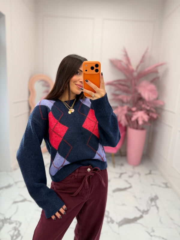 Maglioncino girocollo, in fantasia rombi, modello corto a scatolina, vestibilità regolare. La modella è alta 160cm e indossa la taglia XS.
