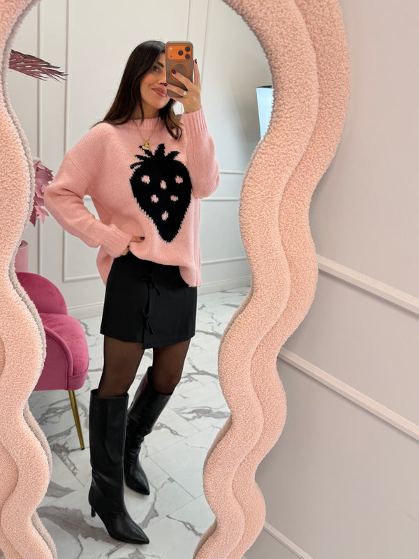 Gonna corta con fiocchetti sul lato sinistro, chiusura tramite zip sul retro. Foderata internamente.