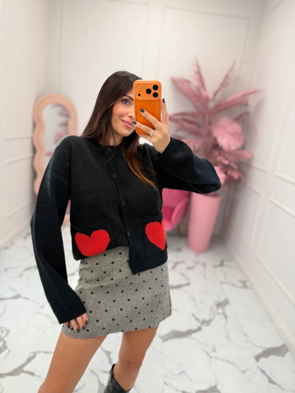 Cardigan girocollo, in maglia, tasche nella parte anteriore con cuori in contrasto colore. Vestibilità regolare, la modella è alta 160cm e indossa la taglia S.